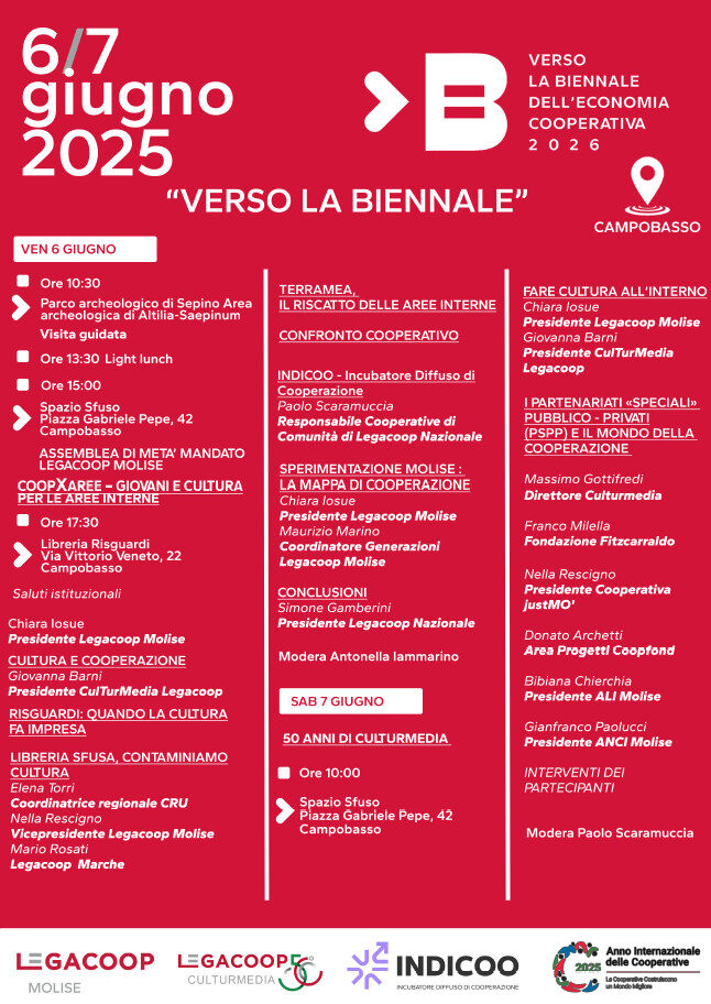 Sta per prendere il via a Campobasso la due giorni “COOPXAREE – Giovani e Cultura per le Aree Interne” organizzata da Legacoop Molise in occasione dell’Assemblea di metà mandato. Il 6 e il 7 giugno 2025, in varie location dentro e fuori città, istituzioni ed associazioni si confronteranno sul lavoro cooperativo per condividere valori, strumenti e strategie utili a costruire un futuro solido e sostenibile per le giovani generazioni.